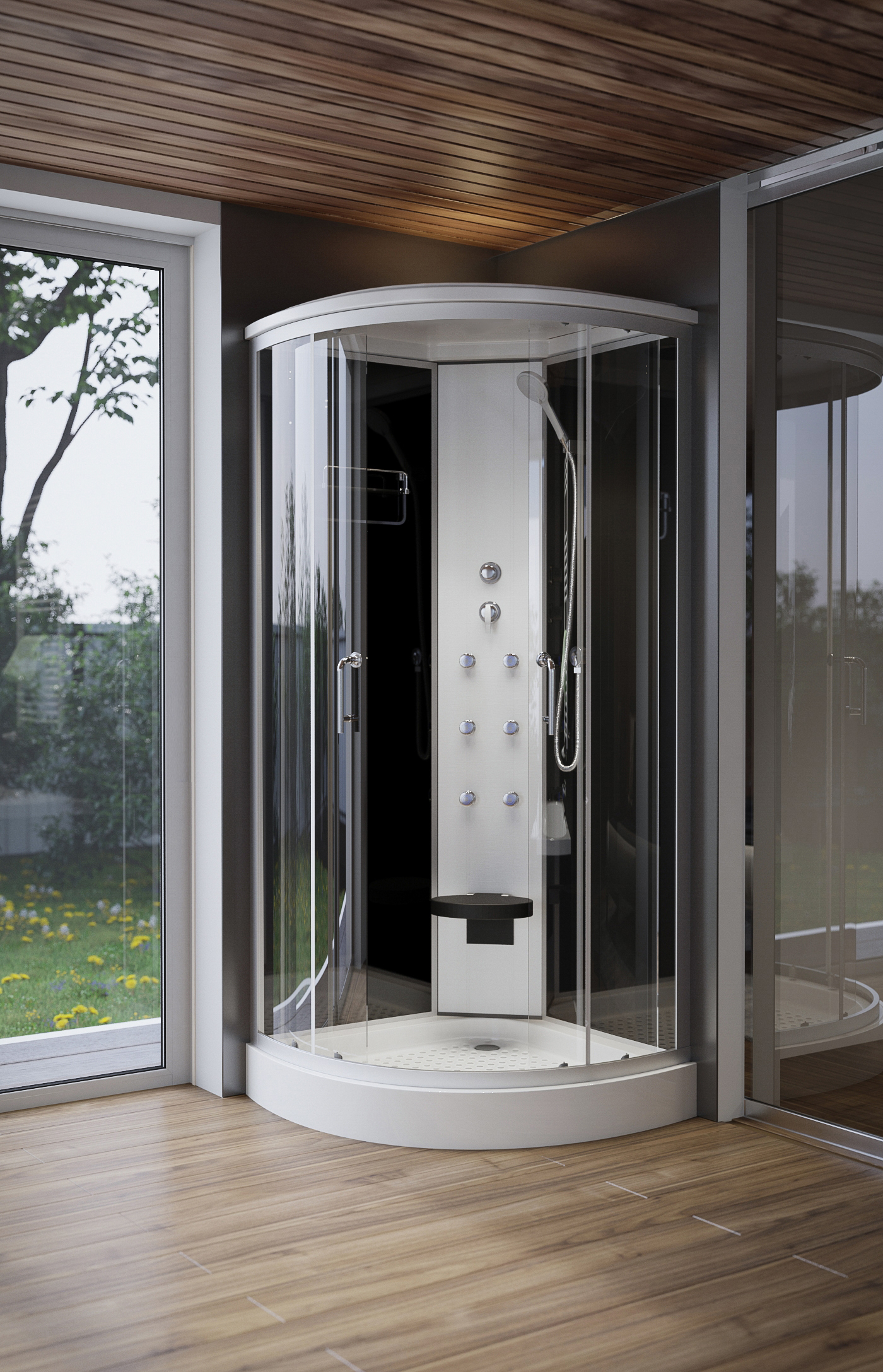Negyedkörívés hidromasszázs zuhanykabin 90x90x215cm Belső magasság 195cm Üvegszál erősítéses, acél merevítésű, fehér színű, alacsony, akril zuhanytálca, állítható fém lábakkal. Matt króm alumíniumívek és profilok. 5 mm víztiszta biztonsági üvegek és ajtók. Fekete színű üveg hátfalak. Mattkróm funkciós panel. 6 db hidromasszázs fúvóka. Kézi zuhany. Felső esőztető zuhany. Felhajtható ülőke. Kerámia betétes keverőszelep és funkció váltó. Piperepolc. Mágneses ajtózár. Görgős ajtónyitás. Leeresztő szelep.
